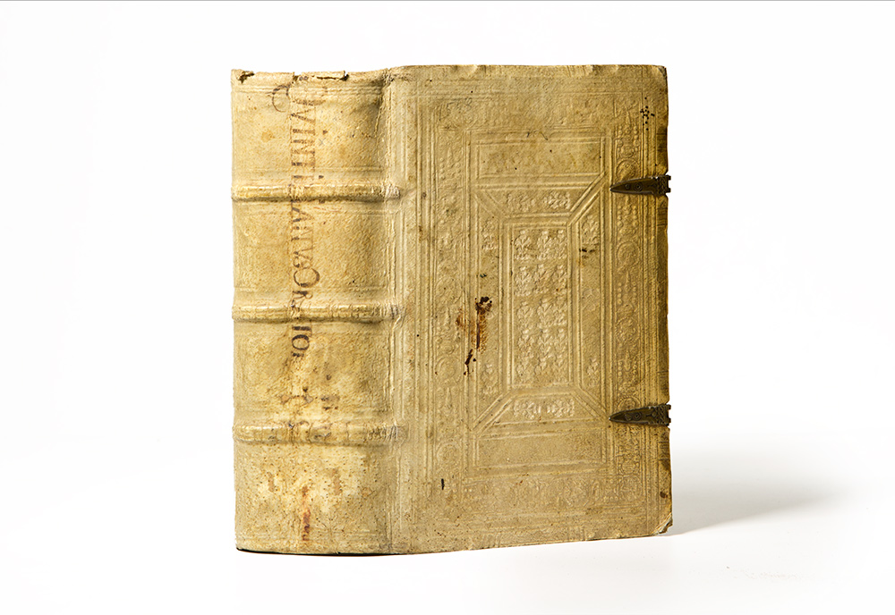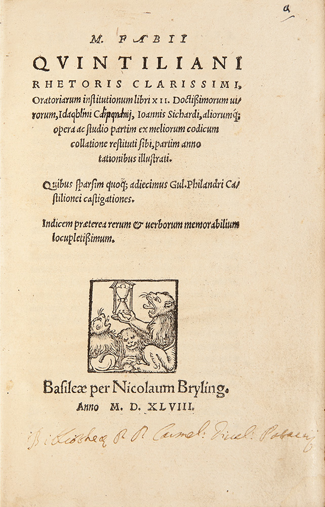 Quintiliano, Marco Fabio M. Fabii Quintiliani rhetoris clarissimi oratoriarum institutionum libri XII Basilea, per Nicolaum Bryling, 1548. In 8°. Marca tipografica al frontespizio e al verso del colophon. Legato con Declamationum liber. Basilea, per Nicolaum Bryling, 1549. Marca tipografica al frontespizio. Legatura coeva in pelle di scrofa con raffinate impressioni a secco ai piatti, fermagli metallici, titolo manoscritto al dorso. Nota di possesso al frontespizio seicentesca di convento estinto. Rara e pregevole edizione, curata da illustri filologi d’oltralpe: Joachim Camerarius, Johann Sichard e Guillaume Philandrier.