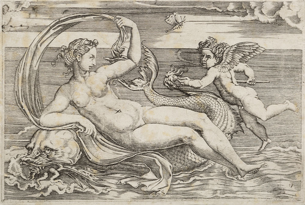 [Raimondi, Marcantonio] Venere reclinata su un delfino con Cupido Bulino,...