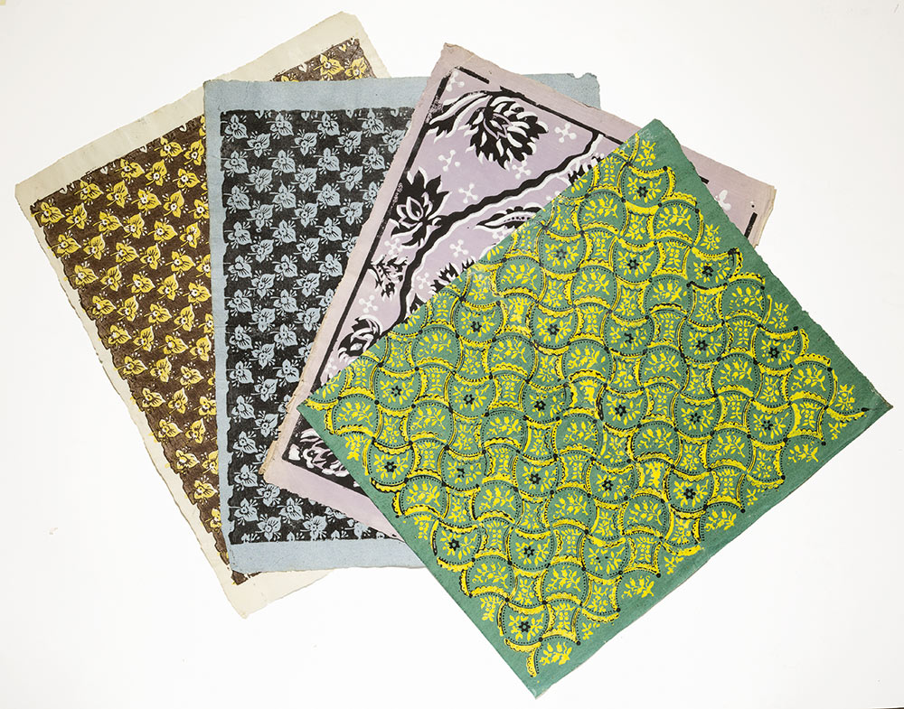 Remondini Trentadue carte decorate Bassano, seconda metà del sec. XVIII, inizio sec. XIX, diverse con filigrana o tracce di filigrana remondiniana, diverse misure ma tutte oltre mm. 450 x 350. Belll’insieme di carte decorate a xilografia. Sono utilizzate tecniche diverse: impressioni di una o più matrici lignee, lavorazione a colla, interventi manuali a mascherina o a pennello. La carta veniva infine sottoposta ad una ulteriore lavorazione di lucidatura con cera e pietra d'agata per far risaltare la brillantezza delle cromie e renderla più resistente al tatto. Queste carte erano destinate a usi diversi: rilegature, fogli di risguardo, decorazioni, ovvero carte da parati.