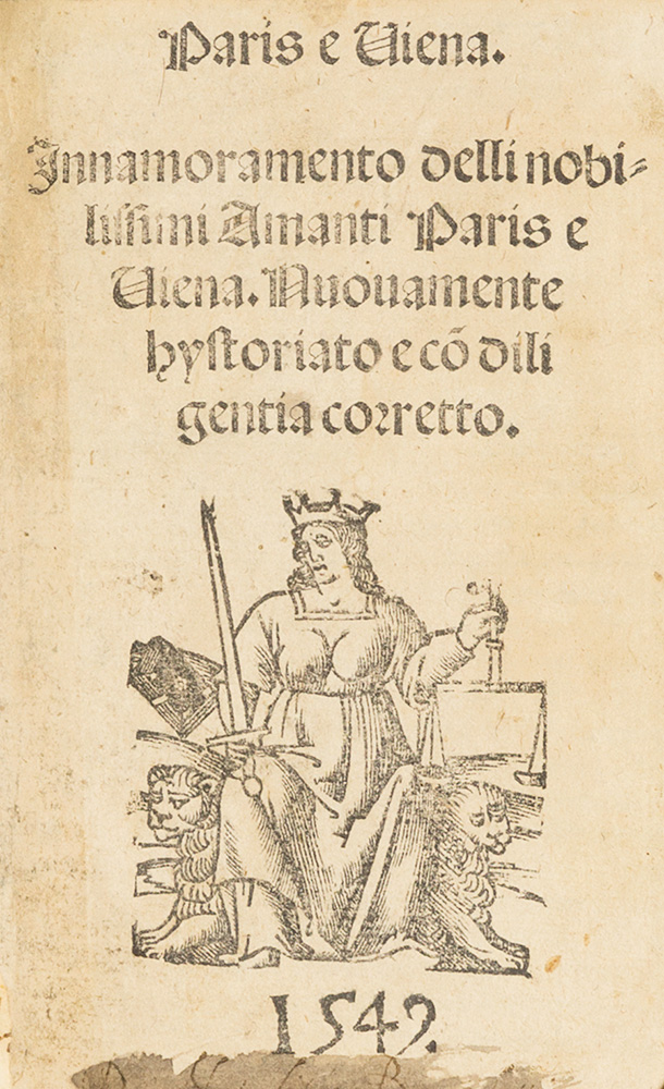 Romanzo cavalleresco Innamoramento delli nobilissimi amanti Paris e Viena. Venezia, per Agustino de Bindoni, 1549. In 8°. Bella marca tipografica xilografica al frontespizio e 29 vignette xilografiche nel testo, macchia al frontespizio, restauri al margine interno delle ultime due carte, legatura in pergamena rigida del sec.XVIII. Rara edizione illustrata. La vicenda narrata nel Paris et Vienne, romanzo cavalleresco provenzale, ripercorre con molta fortuna le tappe del romanzo cortese di impianto "realista", mescolando elementi tratti dal patrimonio popolare e folclorico con quelli scaturiti da una precisa tradizione letteraria, che si riallaccia al ciclo della "Tavola Rotonda". Del Paris et Vienne, una tra le piu celebri narrazioni cavalleresche, conosciuta un po' in tutta Europa, esisterebbero due differenti traduzioni testuali, l'una in prosa, come quella della presente edizione, l'altra in ottava rima. Bellissime le 29 incisioni che corredano il testo e illustrano i passi salienti della storia. Villoresi pagina 106.