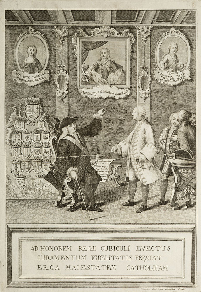 [Roncalli Parolino, Francesco] Exemplaria pictorii operis et musei aulam ornantium comitis [...] Insieme di 9 (di 11) fogli incluso il frontespizio incisi al bulino ed all’acquaforte opera di Dionigi Valesio e Cristosforo Dall’Acqua, macchie su un foglio e piccole lacune ai margini, ciascuno mm. 503 x 320. Serie di tavole che illustrano le vicende del medico-erudito Francesco Roncalli Parolino. Non ci sono indicazioni di data ma probabilmente sono del 1760 c.ca.