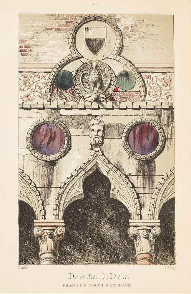 Ruskin, John The Stones of Venice. The Foundations, The Sea-Stories, The Fall Londra, Smith, Elder and Co., 1851-’53. In 4°. 3 voll. Molte illustrazioni xilografiche n.t. e 53 tavole fuori testo, delle quali 24 in diverse tonalità di chiaroscuro e 7 colorate, legatura coeva in mezzo marocchino rosso e cartone marmorizzato policromo. Rara prima edizione figurata. L'opera è un'importante fonte di storia dell'arte e al tempo stesso un orignale trattato di architettura in cui Ruskin applica agli edifici di Venezia i principi generali enunciati nella sua precedente Seven Lamps of Architecture. Le illustrazioni nel testo e le tavole sono tratte dai disegni originali dell'autore. Wise 291, 293, 295; Shepherd 23; Ray 31.