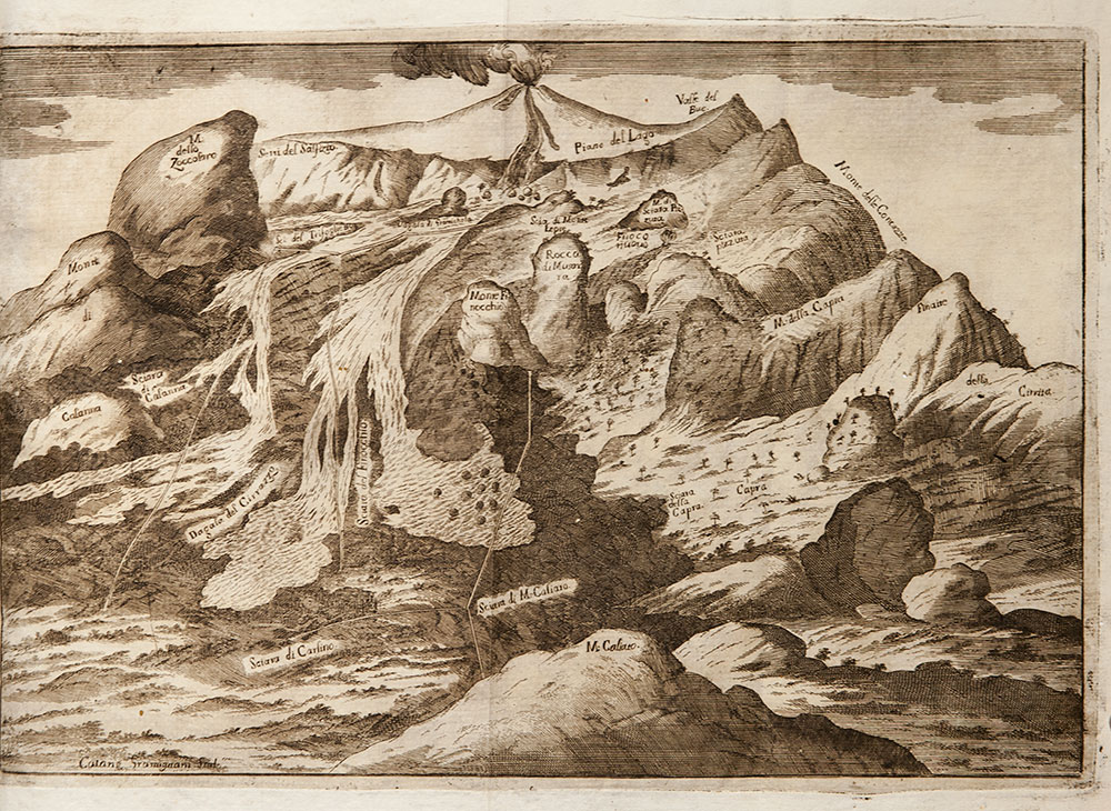 Sicilia - Recupero, Giuseppe Discorso storico sopra l'acque vomitate da Mongibello, e suoi ultimi fuochi avvenuti nel mese di marzo del corrente anno 1755 Catania, nella stamp. di D. Gioachimo Pulejo impress. dell'Accademia degli Etnei, 1755. In 4°. Sul frontespizio il nome dell'autore seguito dalle qualifiche di Socio Colombario fiorentino, Pastore Etneo ed Accademico Gioviale, due carte ripiegate fuori testo raffiguranti la prima l’Etna e il percorso della colata, 280 x 340 mm., la seconda intitolata Carta Oryctografica di Mongibello..., 680 x 480 mm., diffusi lavori di tarlo alle carte di testo ma le tavole sono in ottime condizioni, legatura in cartonato d’attesa coeva. Interessantissima e rara la seconda carta, che raffigura assai dettagliatamente l'Etna e tutto il territorio che circonda il massiccio vulcanico, dalla piana di Catania a Sud - est alle alture oltre Taormina a Nord - Ovest, in scala di 10 miglia siciliane e con l'ausilio di 7 richiami descrittivi che trovano posto nell'angolo inferiore destro, sotto il titolo. Tutte le località e centri abitati sono puntualmente indicati, collegati da una fitta rete viaria, così come i corsi d'acqua, i boschi, e i rilievi montuosi, mentre interessanti notizie circa la fauna e particolari caratteristiche fisiche (la presenza di zolfo, ambra, salnitro ecc.) sono riportate nelle note descrittive. Giuseppe Recupero (1720 - 78), "Segretario dei Pastori Etnei" e membro di svariate società scientifiche e letterarie, è l'autore dell'opera bella e rara dedicata alla storia naturale dell'Etna, dall'orografia alla geologia alla botanica, ed alla vulcanologia propriamente detta, opera pubblicata postuma per le cure del nipote Agatino Recupero. Cfr. Mira,Bibl. siciliana, II / p. 274.