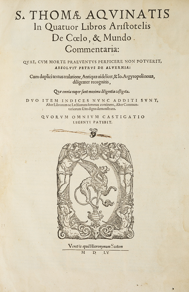 Tommaso d'Aquino, Santo In quatuor libros Aristotelis De coelo, e mundo commentaria Venezia, apud Hieronymum Scotum, 1555. In 2°. Marca tipografica xilografica al frontespizio e ripresa in fine, iniziali animate, diagrammi xilografici nel testo, carattere tondo, testo su due colonne. Marginalia di mano coeva. Legato con Ioannes Philoponus. Commentaria in libros De generatione, et corruptione Aristotelis. Venezia, Scoto, 1558. Ritratto di Aristotele al frontespizio, marca tipografica in fine, iniziali figurate, testo su due colonne, marginalia di mano coeva. Legato con Alessandro D'Afrodisia. Quaestiones naturales, morales et De fato. Venezia, Scoto, 1541. Marca tipografica xilografica al frontespizio e ripresa in fine piu in piccolo, iniziali animate, fregi xilografici, carattere tondo, legatura coeva in piena pergamena. Pregevole volume coevo in cui sono riunite tre importanti opere di astronomia e astrologia.Alessandro d'Afrodisia. Rarissima prima edizione. Importantissimo trattato che riguarda i rapporti tra liberta e determinismo, relativamente soprattutto al destino dell'uomo. Questa edizione era presente nella prestigiosa biblioteca di Pietro Bembo. Adams A-679. Massimo Danzi, La Biblioteca del Cardinal Pietro Bembo, Geneve, 2005.Tommaso d'Aquino. Rara edizione di quest'opera di cosmologia in cui S. Tommaso commenta i quattro libri sul cielo di Aristotele. Adams I,1459 per un'edizione di Scoto, 1575.3. Giovanni Filopono. Rara edizione di quest'opera di cosmologia del filosofo, teologo e scienziato bizantino, che fu il primo commentatore cristiano di Aristotele. Hoffmann II, 441, 6-7; Non in Adams.