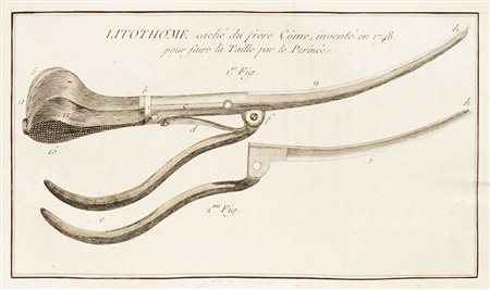 Urologia - Baseilhac, Pascal De la taille latérale par le périnée, et celle de l'Hypogastre, ou haut appareil, rapportée à leurs vrais Auteurs, avec les Règles théoriques Paris, Garon, an XII-1804. In 8°. 2 ritratti e 1 tav. con il bisturi inciso su rame f.t., cartone coevo muto, dedica mss. di mano coeva al verso dell’occhiello, esemplare intonso con barbe. Rara edizione originale. L'autore, nipote di Jean Baseilhac, noto come "Frère Côme" e famoso chirurgo delle vie urinarie, descrive le operazioni e la strumentazione chirurgica perfezionate dal suo avo nel trattamento dei calcoli alla vescica e di altre malattie urinarie. Precedono le biografie di Frère Jacques e Frère Côme, con i loro ritratti: il testo dell'opera è preceduto dalla tavola con il celebre "Bisturi caché". Quérard I, La France littéraire, p. 206; Hirsch, I, 369; Wellcome, II, p. 111.