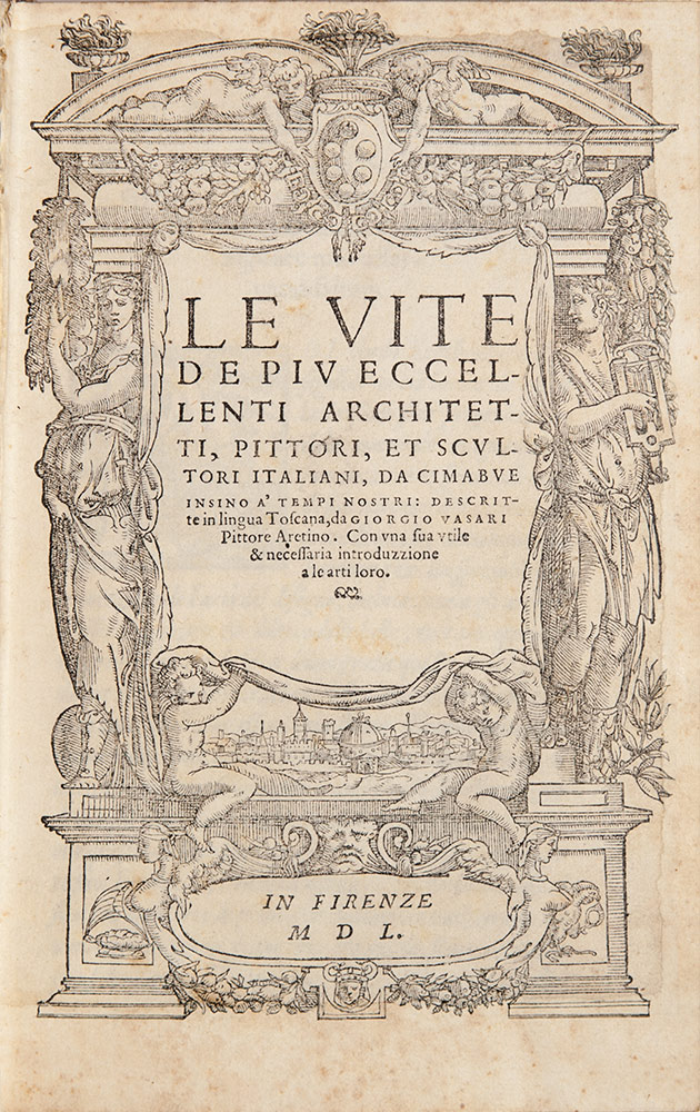 Vasari, Giorgio Le vite de piu eccellenti architetti, pittori, et scultori italiani, da Cimabue insino a tempi nostri Firenze, Lorenzo Torrentino, 1550. In 4°. 3 parti in 2 voll. Frontespizi architettonici xilografici all'inizio della prima e della terza parte, capilettera e illustrazione allegorica incisa in legno a piena pagina in fine, pergamena del secolo XVIII, delicati rinforzi al margine esterno del I frontespizio, restauri all’angolo superiore delle pp.595-606 nel II volume, legatura in pergamena rigida del sec.XIX, tagli a spruzzo rossi. Targhetta al contropiatto del Libraio Pietro Agnelli di Milano; ai contropiatti ex libris di Giovanni Pietro Toesca, con nota di acquisto “Roma 27 X 24” per Lire 2200, presumibilmente dal libraio Rappaport, di cui compare un tassello sul secondo volume. FIRST EDITION OF "THE FIRST MODERN HISTORY OF ART" (PMM 88, per la seconda edizione del 1568.). Le Vite sono "a vital contribution to our understanding of the character and psychology of the great artists of the Renaissance, a term (Rinascita) which he was the first writer to use" (PMM 88). Illustre provenienza: G.P. Teosca (1877-1962) è stato uno dei più insigni storici dell’Arte Medievale, allievo di Venturi, Accademico Linceo e Direttore della Treccani.Il nome di Vasari è ricordato per le Vite, pubblicate per la prima volta nel 1550 e in seconda edizione nel 1568. L’opera è ritenuta la prima raccolta moderna e sistematica di biografie artistiche: più di 160 i personaggi descritti, tra architetti, pittori e scultori. I resoconti partono da Cimabue per arrivare a Michelangelo, e sono organizzati secondo una logica precisa: per il Vasari gli artisti fiorentini sono gli unici ad aver fatto rinascere l’arte dal buio del Medioevo e con Michelangelo questo processo di rinnovamento tocca il suo punto più alto. Con le Vite Giorgio Vasari è l’iniziatore di un genere di successo, quello della biografia legata all’arte: basti pensare che la seconda edizione, integrata anche da immagini, ha avuto otto traduzioni straniere e 18 successive edizioni italiane.