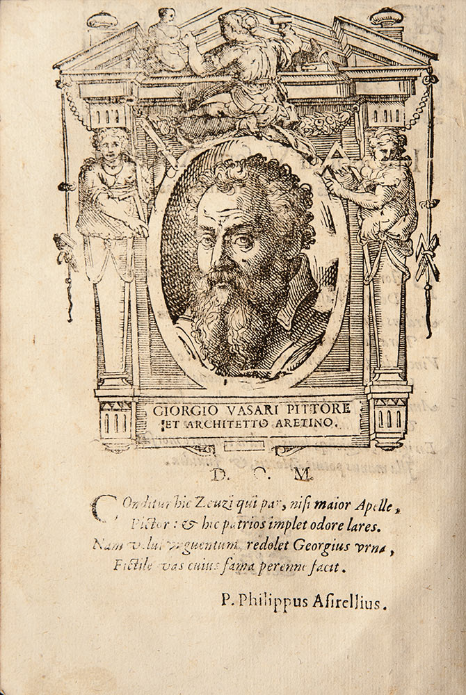Vasari, Giorgio Trattato delle Pittura Firenze, appresso i Giunti, 1619. In 4°. Marca al frontespizio, ritratto dell’autore, bruniture, legatura in vitello screziato del sec.XVIII, tagli a spruzzo rossi, spellature e difetti. Giorgio Vasari, nipote dell'autore, avrebbe continuato l'opera lasciata imperfetta dallo zio, cfr. G. Melzi. Opere anonime e pseudonime, vol. 3, p. 196. Si tratterebbe in realtà dela stessa prima edizione del 1588, con frontespizio e colophon mutato, rimessa in commercio per vendere le copie di magazzino.