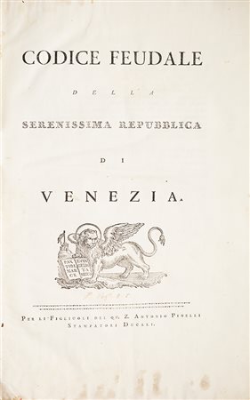Venezia - Leggi Codice Feudale della Serenissima Repubblica di Venezia - Venezia, Figliuoli del Qu. Z. Antonio Pinelli, [1780-'82]. In 2°.Frontespizio con grande xilografia raffigurante il leone di S. Marco, capilettera ornati, testo su due colonne, bella legatura veneziana coeva in pieno vitello marezzato, dorso a 5 nervi con fregi oro, sguardie in carta marmorizzata policroma Edizioni originali. Il Codice contiene le leggi relative ai diritti feudali che ebbero corso nella Repubblica di Venezia, in Terraferma e sui territori d'oltremare, dal 1328 al 1780. Cicogna 1239; S. Zamperetti, La figura del feudatario nella Repubblica di Venezia di fine '700, "Acta Histriae", 15-1, 2007, pp. 235-248.