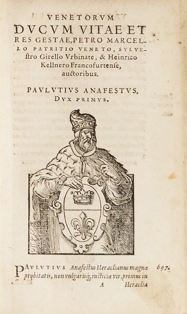 Venezia - Marcello, Pietro De vita, moribus, et rebus gestis omnium ducum Venetorumezza Francoforte, P.Reffeler, 1574. In 8°. Frontespizio con marca tipografica di Feyerabend xilografica, iniziali ornate e fregi xilografici, 103 figure a mezza pagina xilografiche nel testo, legatura in cartonato alla rustica. Rara prima edizione latina figurata. Opera illustrata da 103 figure xilografiche di Jost Amman: 83 ritratti di Dogi col proprio stemma e 20 monumenti sepolcrali. Si tratta di una raccolta di notizie sulla vita, i costumi e le imprese dei Dogi di Venezia, opera curata da Heinrich Kellnerame. La prima parte comincia con la biografia di Paolo Anapesto, eletto Doge nel 697 e finisce con Agostino Barbarigo, eletto nel 1486. La seconda parte copre gli anni dal 1501 al 1544, dal Doge Leonardo Loredan a Pietro Lando e fu aggiunta nell'edizione del 1554. La terza parte si conclude con l'ottantaquattresimo Doge, Alvise Mocenigo, eletto nel 1570. Infine alcuni versi su importanti episodi della storia di Venezia, del poeta veneziano Bernardo Giorgio, seguiti dalla lista cronologica dei Dogi. Cicogna n. 2252.