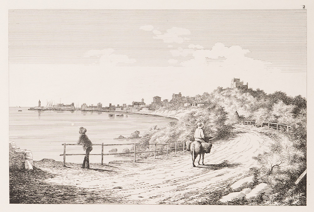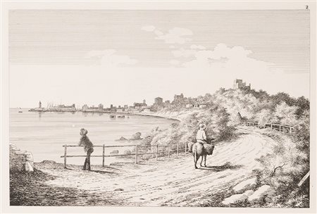 Villa Borghese Nettuno Villa bell'aspetto e suoi dintorni s.d.t. Frontespizio figurato con simbolo dello stemma Borghese inciso su una pietra e firma in basso a destra, seguono 20 tavole numerate incise in rame su carta fine ed incollate su supporto cartaceo, la maggior parte con monogramma "PG" in lastra, legatura in mezzo zigrino rosso, lievi difetti. Bella suite di tavole che immortalano la Villa di Bell'Aspetto ed il territorio circostante. La villa venne costruita nel 1648, ad opera del cardinale Vincenzo Costaguti; nel 1832 passò di proprietà al Principe Don Camillo Borghese. Da questo momento accanto al nome di Villa di Bell’Aspetto ricorrerà quello di Villa Borghese.