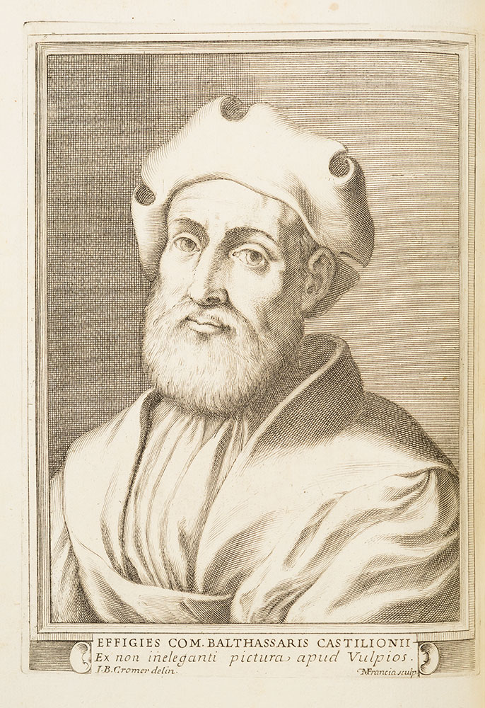 Castiglione, Baldassarre Il libro del Cortegiano del conte Baldessar Castiglione Padova, Giuseppe Comino, 1766. In 4°. Marca calcografica del Comino raffigurante il Cercatore di anticaglie con motto, stemma calcografico del dedicatario Antonmaria Borromeo, ritratto dell'autore disegnato da I. B. Cromer ed inciso da M. Francia, 5 capilettera, 4 testate e 4 finalini, legatura del sec. XIX in mezzo marocchino marrone, al dorso autore e titolo in oro. Volume assai raro: uno dei soli 100 esemplari della tiratura particolare di questa edizione in cui il testo è dato senza le omissioni ed alterazioni introdotte dal Ciccarelli nel 1584, quando il testo venne giudicato troppo libero. Gli esemplari ordinari hanno il testo censurato e sono una esatta ristampa dell’edizione del Comino del 1733. Gamba 296, nota; Federici 271; Razzolini 425.