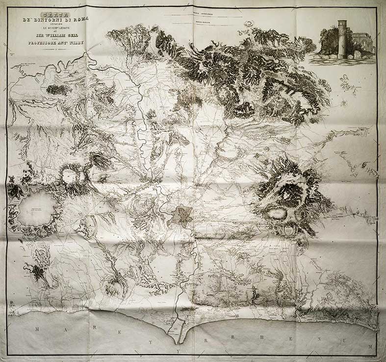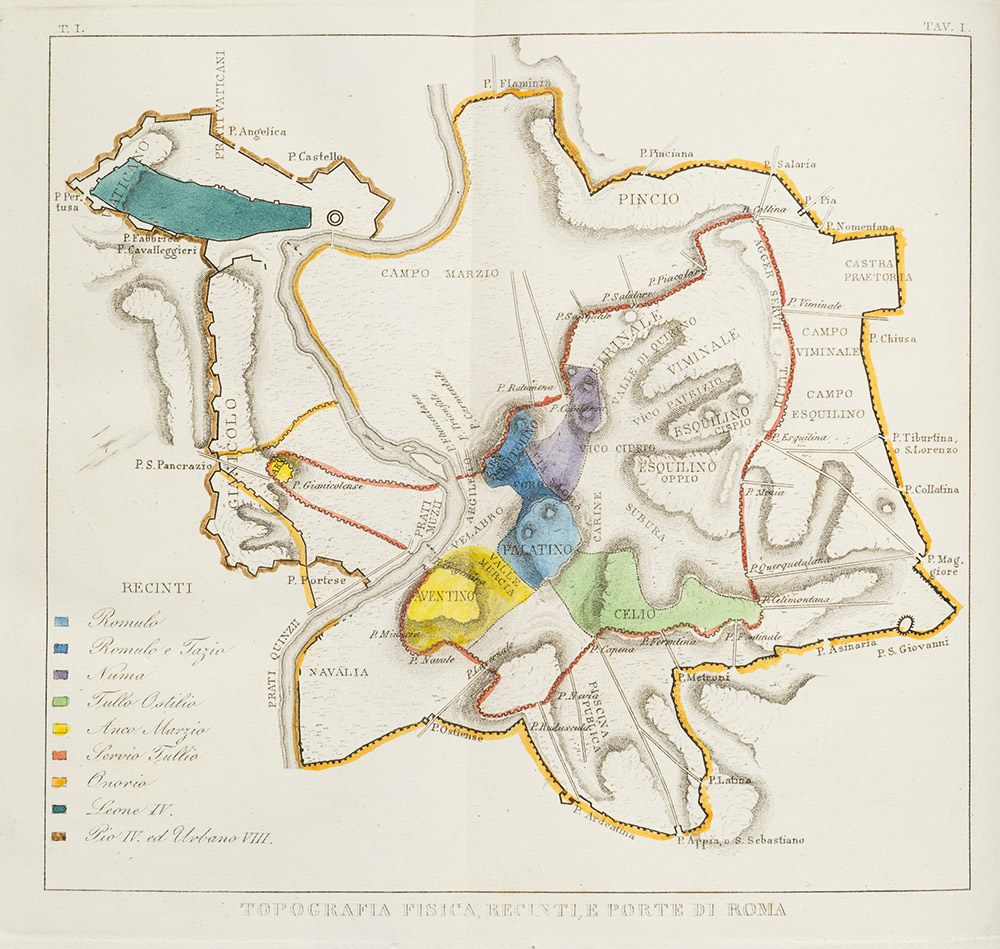 Nibby, Antonio Roma nell'anno MDCCCXXXVIII Roma, tipografia delle belle arti, 1838 - 41. In 8° 4 voll. Pianta ripiegata e colorata di Roma e 62 tavole fuori testo incise in rame da Cottafavi, incluse 45 vedute, mancante il ritratto dell’autore altrimenti in ottime condizioni, legatura coeva in vitello nocciola, piatti inquadrati da cornice di triplice filetto, al dorso liscio autore e titolo e vaso stilizzato impressi in oro, tagli marmorizzati policromi, restauri alle cerniere. Ex libris “J.H.Harrison” al contropiatto. Nel lotto anche la pianta ripiegata Carta de' dintorni di Roma secondo le osservazioni di sir William Gell e del professore Ant.o Nibby,1827, incisa da Filippo Troiani, consevata in cartella in mezza pergamena dell’epoca. I primi due volumi si riferiscono a Roma antica mentre gli altri due trattano di Roma moderna: l’insieme costituisce una delle guide più importanti dell’Ottocento, sia per la parte di testo dovuta alle ricerche del noto studioso romano che per la ricca parte iconografica costituita dalle numerose, pregevoli incisioni in rame. Olschki Choix 17659 " L’importance de cet ouvrage est bien connue; les auteurs qui ont successivement écrit sur Rome y ont abbondamment puisé [...] Tres recherché, cet ouvrage est devenu assez rare"; Schudt 450.