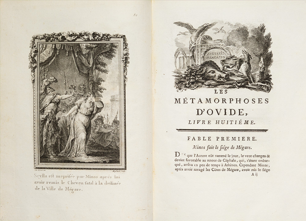 Ovidio Nasone, Publio Les metamporphoses d'Ovide, en latin et en francois. De la traduction de M. l'abbe Banier, de l'Academie Royale des Inscriptions & Belles Lettres; avec des explications historiques Parigi, Delalain, 1767 - 1771. In 4°. 4 tomi. Frontespizi stampati in rosso e nero e con vignetta allegorica, 2 carte di dedica, 30 vignette e un cul-de-lampe a piena pagina in fine al tomo quarto, con 140 tavole da Boucher, Eisen, Gravelot, Le Prince, Monnet, Moreau, Choffard, finemente incise in rame da Basan, de Ghendt, de Launay, de Longeuil, Le Mire, Saint-Aubin, legatura coeva in vitello avana con decorazione impressa in oro, piatti inquadrati da cornice di triplice filetto, dorso a 5 nervi, ai compartimenti tasselli con titolo e ferri di melograno, tagli dorati, sguardie marmorizzate, lievi difetti e leggere macchie. Seconda edizione di questa superba opera dedicata al duca de Chartres, pubblicata dai figli dell’editore Basan e dell’incisore Le Mire. "C'est un des plus galamment illustres de tout le siecle" (Cohen).