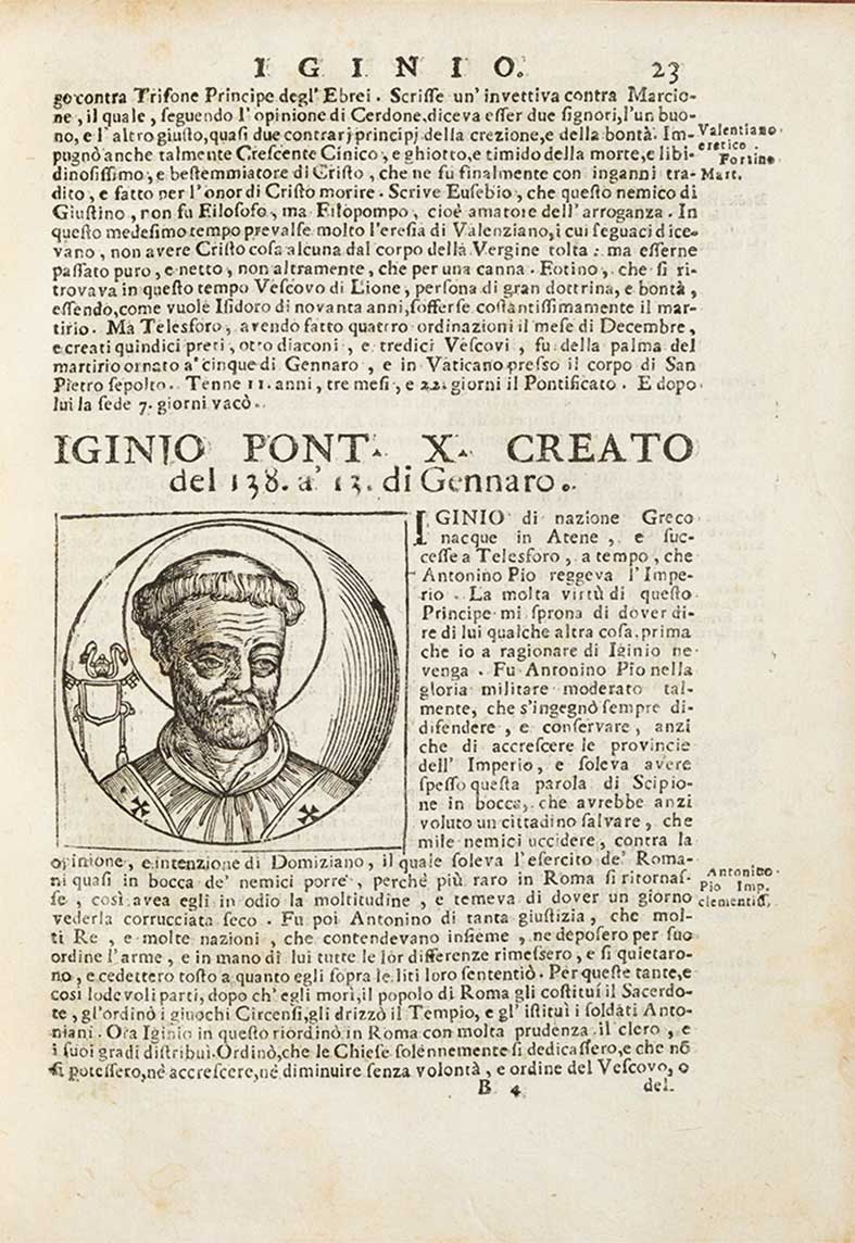 Platina, Bartolomeo Le vite de’ i pontefici [...] descritte da Onofrio Panvinio [...] Venezia, a spese della Compagnia, 1744. In 4°. 2 voll. Capilettera ornati, centinaia di ritratti xilografici nel testo, lacune ai margini di 6 carte da b6 a c2, arrossature e macchie, legatura in pelle rossa moderna, piatti inquadrati da duplice cornice impressa in oro, al centro festone stilizzato, dorso a 5 nervi, ai comparti ricca decorazione, autore e titolo, tagli rossi, nota di possesso manoscritta al frontespizio. Non comune edizione settecentesca di questa celeberrima storia dei papi. Il Platina non fu solo un educatore, ma anche un umanista rinascimentale, studioso di letteratura e di tradizioni popolari: sul finire del 1461 si trasferì a Roma al servizio del giovane cardinale Francesco Gonzaga, in qualità di suo segretario; divenne abbreviatore dei papi Pio II e Paolo II con alterne fortune. Sotto il papato di Sisto IV, fu nominato nel 1478 direttore della Biblioteca Vaticana dove scrisse il Liber de vita Christi ac omnium pontificum, una raccolta delle biografie dei pontefici vissuti sino ad allora, di cui l’opera presente è traduzione. Negli stessi anni pubblicò il De principe, il De vera nobilitate e il De falso et vero et bono. Il suo lavoro principale resta tuttavia un breve trattato di gastronomia, il De honesta voluptate et valetudine.