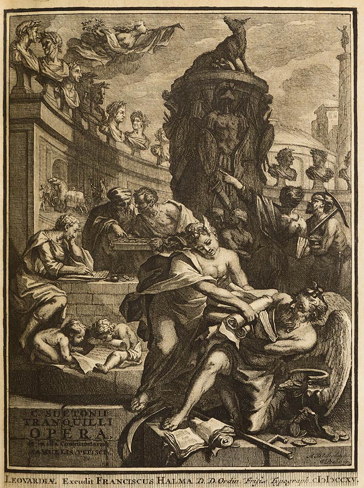 Svetonio, Caio Tranquillo Opera Leeuwarden, F. Halma, 1714 - 15. In 4°. 2 voll. Frontespizio stampato in rosso e nero e con vignetta allegorica, con 29 tavole incise in rame di cui 6 ripiegate, inclusa l’elegante antiporta figurata, esemplari con brunitura uniforme leggera e gora d’acqua, mancante la seconda antiporta, legatura coeva in pergamena, al dorso liscio tassello in pelle con autore e titolo impressi in oro. Nota di possesso manoscritta al foglio di guardia. Brunet V, 582; Ebert 21935; Lipsius 386.
