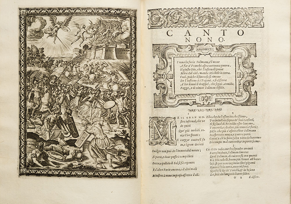 Tasso, Torquato La Gierusalemme liberata Genova, Girolamo Bartoli, 1590. In 4º. Frontespizio calcografico con cornice architettonica sormontata dal ritratto dell'autore tra due putti e vedutina di Genova al margine inferiore, 20 tavole a piena pagina in principio di ciascun canto incise in rame da originali di Bernardo Castello, testate, capilettera ornati, finalini e cornici a cartiglio per l'argomento dei canti incise in legno, legatura del sec. XVIII in vitello marrone, dorso a 5 nervi con fregi e titolo impressi in oro, tagli a spruzzo policromi, lievi restauri e piccole mancanze al dorso. Prima edizione illustrata in buon esemplare della Gerusalemme, nonchè prima edizione del commento di Gentili e Gustavini. Gamba 948: questa edizione deve la sua fama "all'ornamento delle figure le quali furono intagliate con molta franchezza da Agostino Caracci e da Giacomo Franco". Adams T,243; Cicognara 1112; Brunet V, 665.