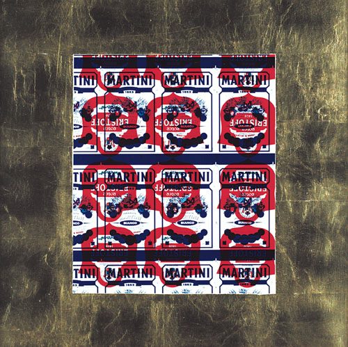 MAX CERTI Martigny (Svizzera) 15/07/1977 Martini, Eristoff, 2011 imitazione foglia d'oro ed etichette originali su tela cm. 60x60, firma, titolo, anno e tecnica al retro, dichiarazione d'autenticità dell'artista su foto