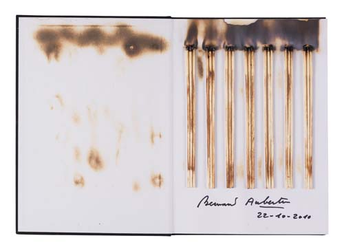 BERNARD AUBERTIN Fontenay aux Roses 1934 Senza titolo applicazioni di fiammiferi e combustioni su libro "Bernard Aubertin, il fuoco e il rosso", edizioni Galleria Rosenberg cm. 30x45, firma e data in basso a destra, dichiarazione d'autenticità dell'artista su foto, entro teca in plexiglass.