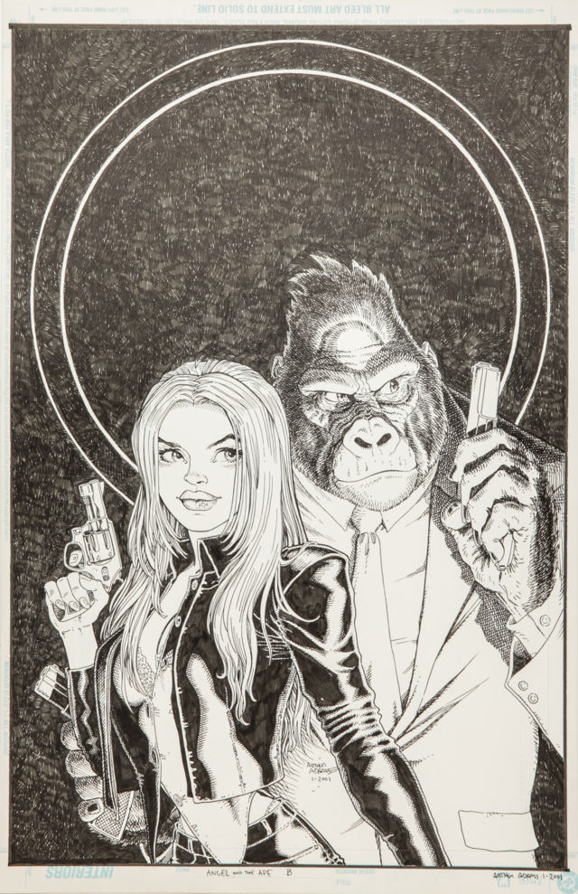 Arthur Adams "Angel and the Ape", 2001 matita e china su cartoncino DC, 28 x 43 cm Illustrazione originale eseguita da Adams nel 2001 come copertina, poi non utilizzata, per la serie "Angel and the Ape" della Vertigo. Firmata e datata.