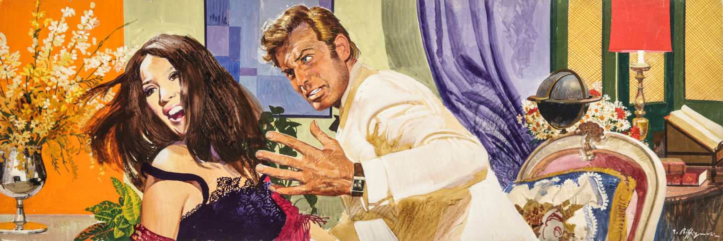 Alessandro Biffignandi "Appuntamento a Montecarlo", anni '60 tempera su cartone, 66,5 x 22,5 cm Illustrazione originale per "Appuntamento a Montecarlo" edita su Confidenze n.1319 a pagg. 46-47. Firmata.