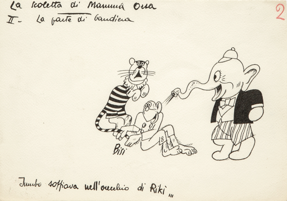 Carlo Bisi "Jumbo soffiava nell'orecchio di Ricki", anni '30 matita e china su cartoncino, 23,5 x 16,5 cm Illustrazione originale realizzata da Bisi per una pubblicazione dedicata all'infanzia ed ispirata ai personaggi della rivista Jumbo, edita dalla SAEV nel 1930. Firmata.