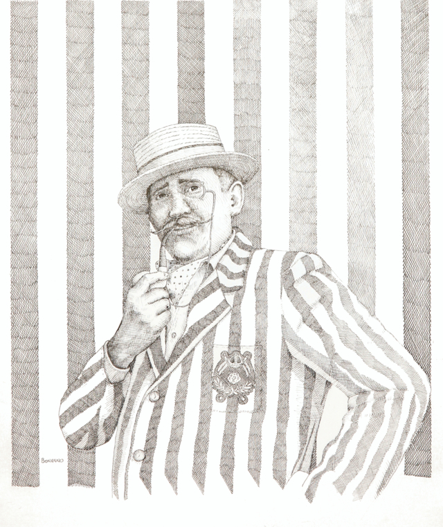 Antonio Bonanno "Mustacchi", 2014 china su cartoncino, 24,5 x 33 cm Originale di copertina realizzata da Bonanno per il volume "Mustacchi", edito in Italia da Ed. Logos e in Francia da Édition du Lampion nel 2014. Nato come art director di importanti case editrici italiane, Bonanno sviluppa subito una sua personalissima cifra grafica che gli permette di affermarsi come illustratore di successo in patria e in Francia, dove negli ultimi anni sta riscuotendo un sempre maggior numero di consensi. Firmata.