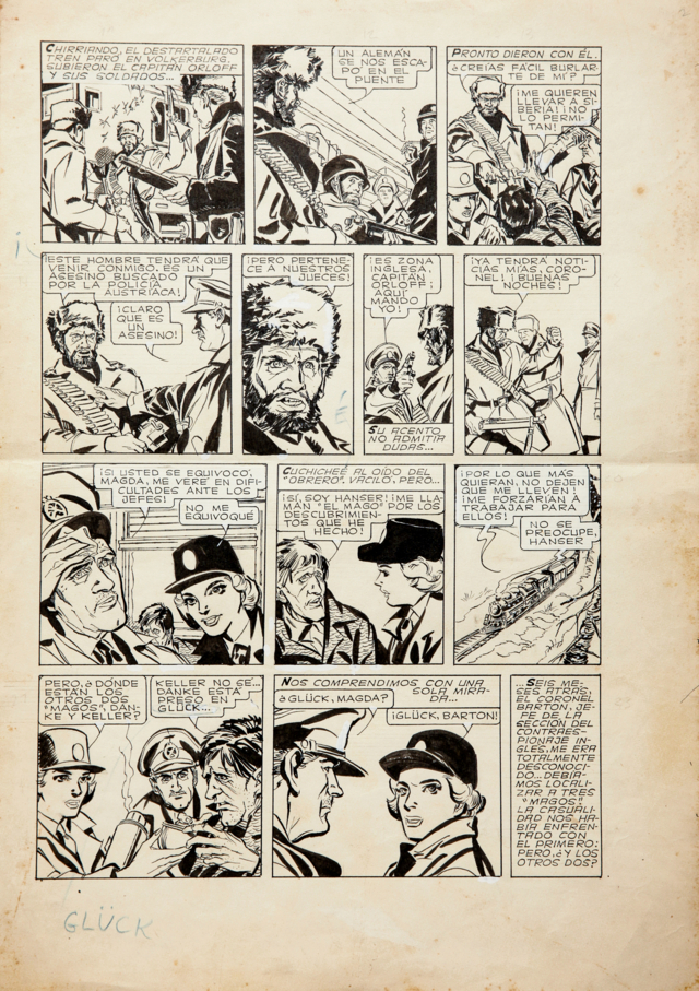 Alberto Breccia "Mision Thyuraine", 1961 matita e china su cartoncino, 32 x 45 cm Tavola originale realizzata da Breccia per "Mision Thyuraine", storia edita sulla rivista argentina Patoruzito n.790 nel 1961. Testi di Leonardo Wadel. Piega orizzontale al centro.