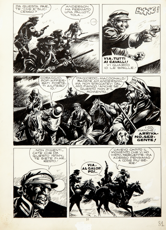 Renzo Calegari "Storia del West - La Pattuglia", 1968 matita e china su cartoncino, 29,5 x 40,5 cm Tavola originale per "La pattuglia" edita a pag.31 su Storia del West n.10 dalla Bonelli nel 1968.