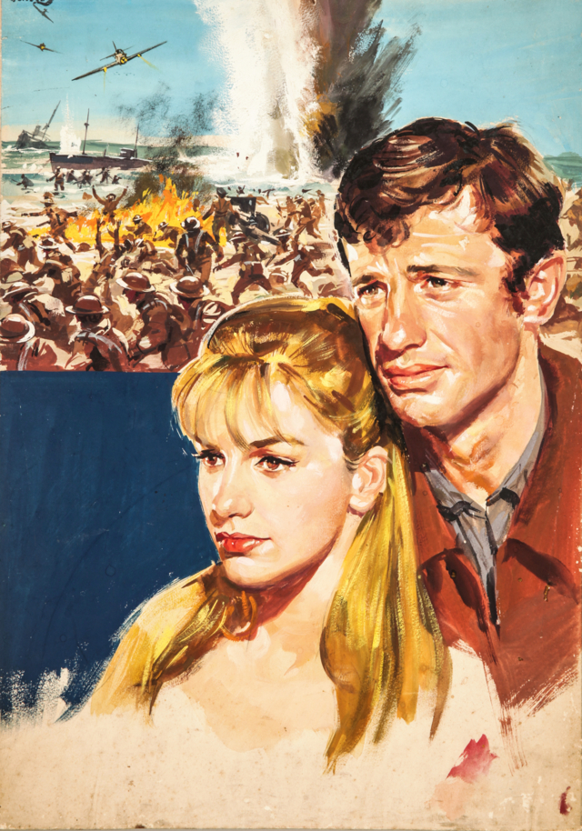 Averardo Ciriello "Week-end a Zuydcoote", 1964 tempera su cartoncino montato su cartone, 31,5 x 44,5 cm Bozzetto originale realizzato da Ciriello per il manifesto ufficiale del film italio francese "Week-end a Zuydcoote", raffigurante i due protagonisti Jean-Paul Belmondo e Catherine Spaak. Firmato.