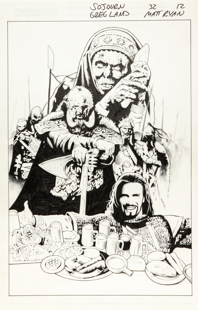 Greg Land "Sojourn", 2004 matita e china su cartoncino, 28 x 43 cm Splash page originale per Sojourn n.32 edita dalla Cross Generation Comics nel 2004. Chine di Matt Ryan. Firmata e datata al retro.