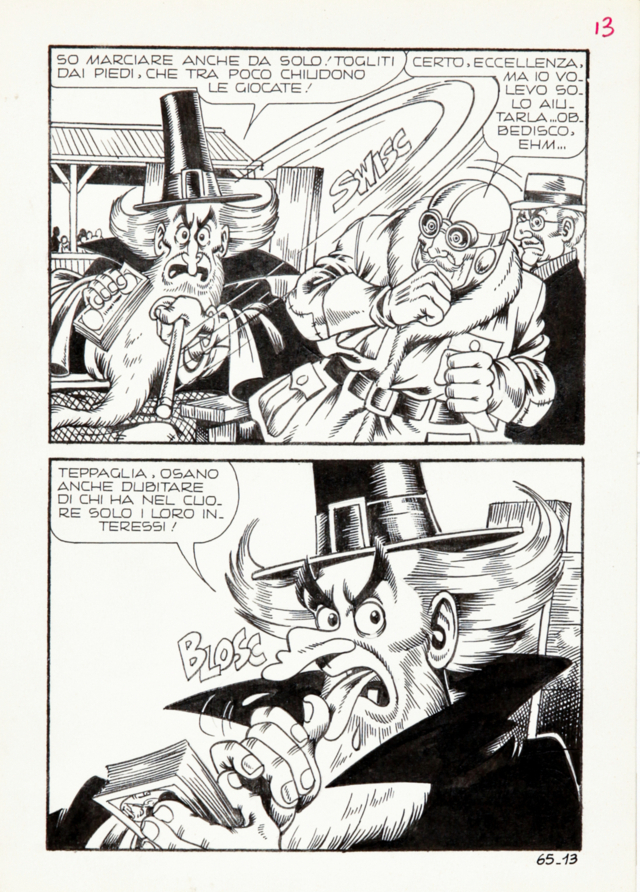 (Roberto Raviola) Magnus "Alan Ford - Un tiro mancino", 1974 matita e china su cartoncino, 18 x 25 cm Tavola originale per "Un tiro mancino" edita a pag.13 su Alan Ford n.65 nal 1974.