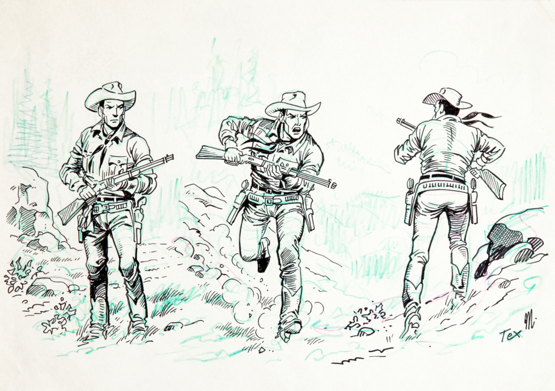 (Roberto Raviola) Magnus "Tex" china e pastelli su cartoncino, 29,5 x 21 cm Studio originale realizzato da Magnus per il suo Texone "La valle del terrore" edito dalla Bonelli nel 1996. Firmato.