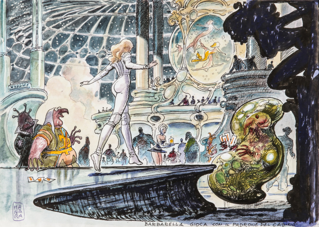 Milo Manara "Barbarella gioca" matita, china e acquerello su carta, 29,5 x 21 cm Bozzetto realizzato da Manara per il remake del film "Barbarella". Firmato e titolato.