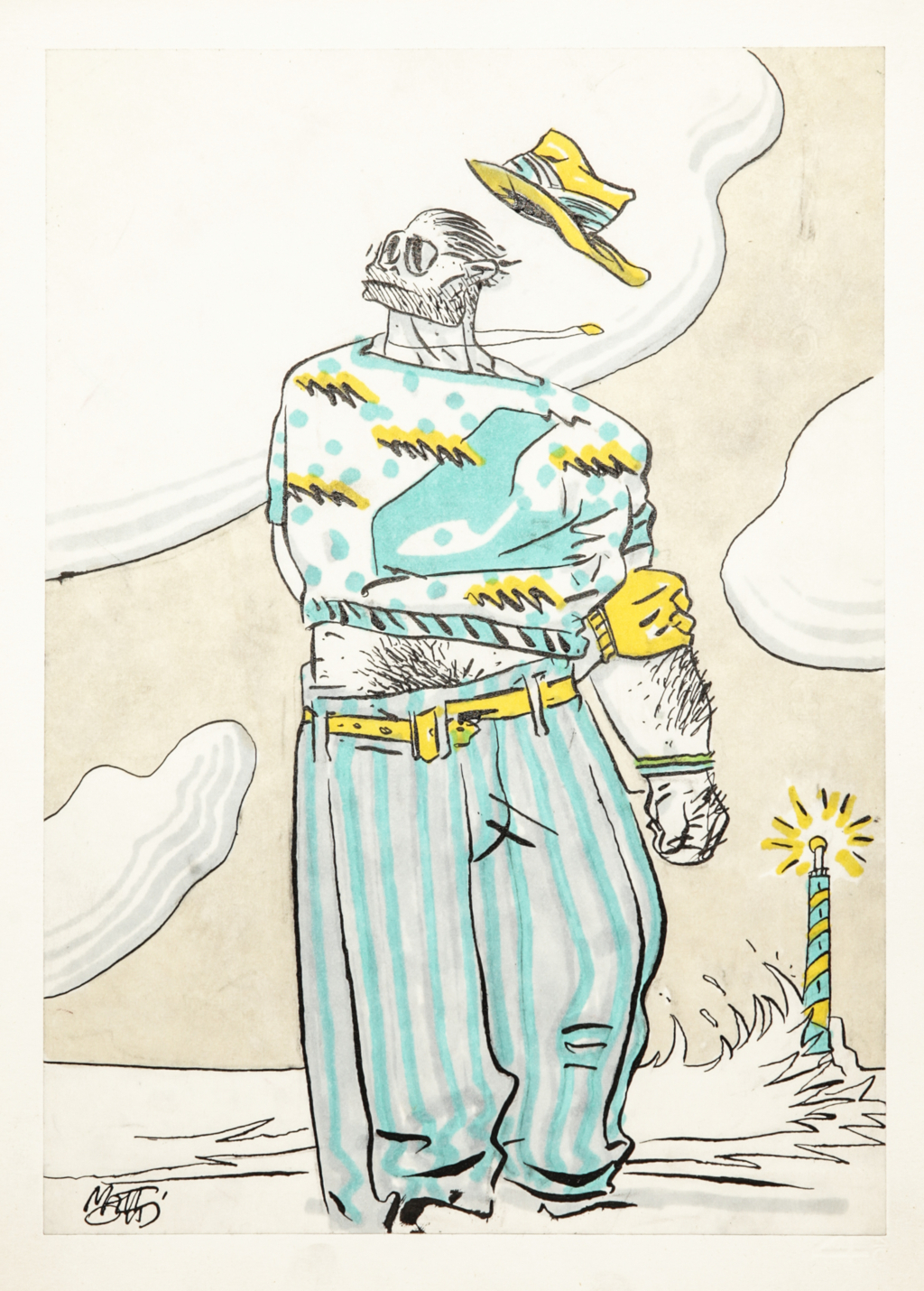 Lorenzo Mattotti "Il vento", anni '80 tecnica mista su carta applicata su cartoncino, 21 x 29,5 cm Illustrazione originale realizzata da Mattotti nel suo pieno periodo "Valvoline". Firmata.