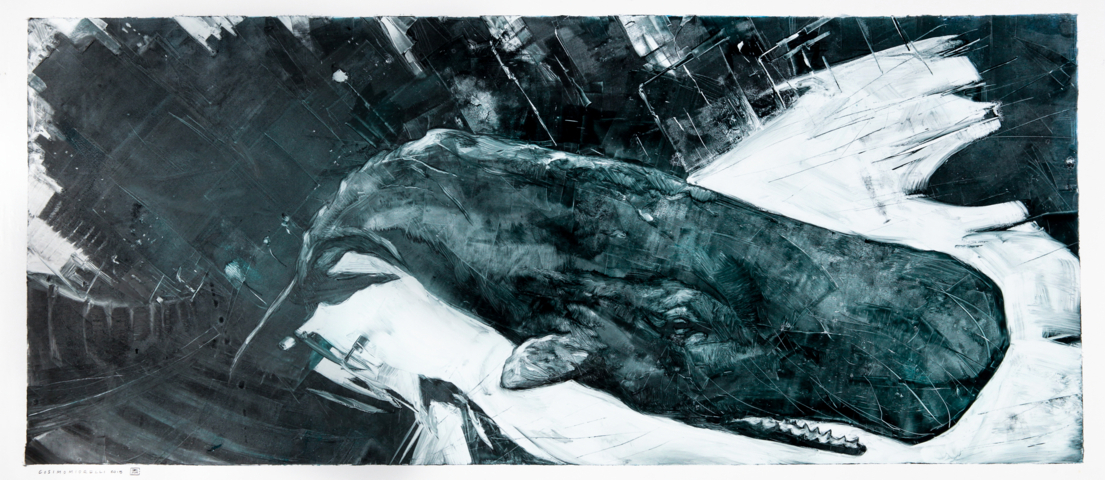 Cosimo Miorelli "Pottwal", 2015 olio su carta fotografica, 69,5 x 31,5 cm Illustrazione originale realizzata da Miorelli per la sua serie di "Urban whaling". Illustratore, live performer e artista visivo, Miorelli si avvicina al mondo del fumetto spinto dal padre Moreno (autore di Campofame del grande Paz), con "Athos. Appunti dalla Montagna Santa" edito nel 2012 dalle Edizioni Di. Il suo trasferimento nella capitale tedesca lo porta a riflettere sul conflitto tra urbanizzazione e spirito selvaggio della natura, simboleggiando con le sue oniriche balene la continua lotta per la sopravvivenza tra uomo e natura. Firmata e datata.