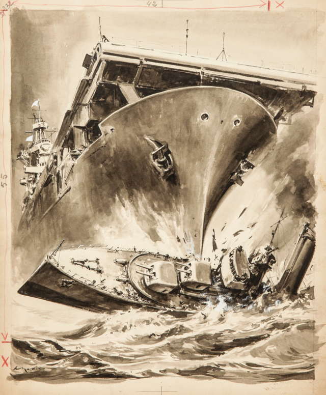 Walter Molino "La collisione della portaerei Wasp", 1952 acquerello e tempera su cartoncino, 31,5 x 38 cm Originale di copertina per La Domenica del Corriere n.19 anno LIV del 1952. La scena raffigura la tragica collisione tra la portaerei americana Wasp e il caccia-dragamine Hobson avvenuta al largo delle Azzorre. Si allega la pubblicazione cartacea. Firmata.