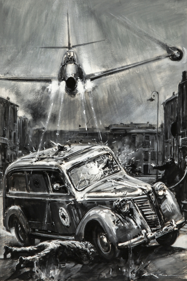 Walter Molino "Attacco alla Croce Rossa", anni '50/'60 china e tempera su cartone, 20,5 x 30 cm Illustrazione originale realizzata da Molino per una pagina interna de La Domenica del Corriere. Firmata.
