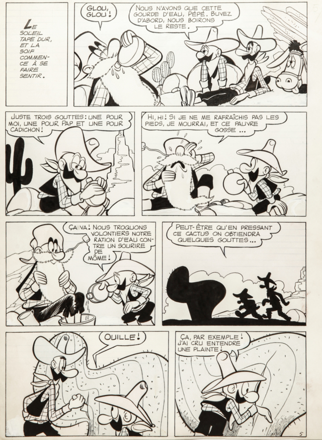 Giulio Chierchini "Pop e Fuzzy", anni '60 matita e china su cartoncino, 25 x 32 cm Tavola originale realizzata da Chierchini per Pop e Fuzzy, due improbabili e sgangherati banditi che vorrebbero imitare le imprese di un temuto fuorilegge del vecchio west. Questi due personaggi furono creati dal genio di Bottaro nel 1955 quado videro la luce sul Pepito delle edizioni Alpe e successivamente furono anche ristampati in Francia con il nome di Pop e Pap grazie alla casa editrice Sagédition. Acquerellata al retro.