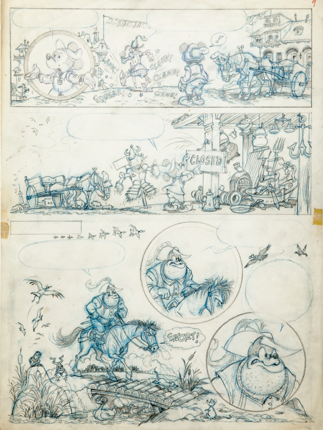 Hector Adolfo De Urtiaga "Le grandi parodie - Don Pippo Chisciotte", 1987 matita e pastello su carta, 35,5 x 48 cm Tavola originale per "Don Pippo Chisciotte" edita a pag. 9 nella storica serie delle grandi parodie Disney nel 1987. Le matite di De Urtiága danno la possibilità di godere delle tavole di questa storia in tutta la loro bellezza.
