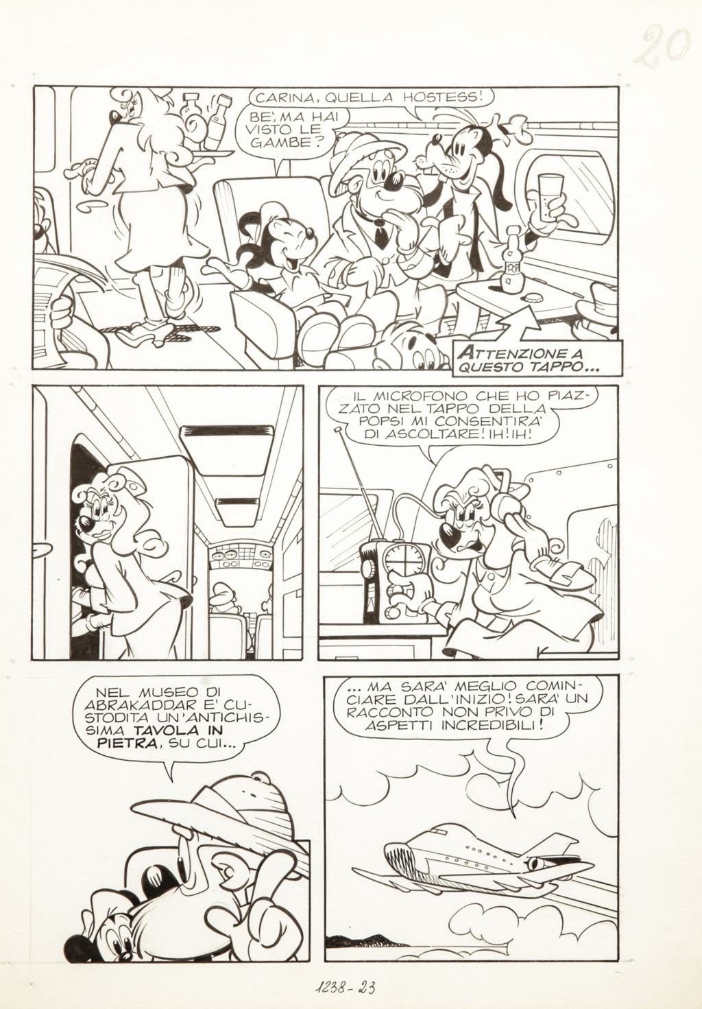 Massimo De Vita "Topolino e l'enigma di Mu", 1979 matita e china su cartoncino, 25 x 35 cm Tavola originale per "Topolino e l'enigma di Mu" edita su Topolino n.1238 dalla Dinsey nel 1979. Prima apparizzione assoluta del Dr. Zapotec, personaggio creato dalla matita del grande De Vita, che qui vediamo insieme agli altri due protagonisti di questa storica avventura.