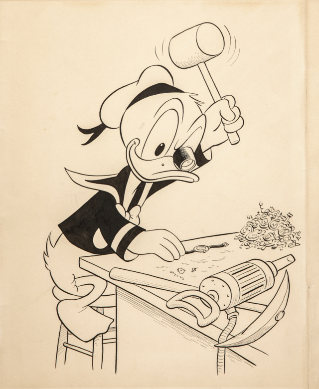 Dick Moores "Paperino orologiaio", anni '60/'70 matita e china su cartoncino, 29,2 x 35,5 cm Illustrazione originale realizzata da Moores probabilmente per una copertina.