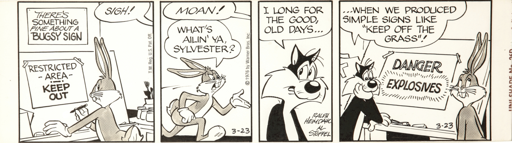 Ralph Heimdahl "Bugs Bunny ", 1976 matita e china su cartoncino, 44 x 12,5 cm Striscia giornaliera del 23/03/1976 per "Bugs Bunny" con i testi di Al Stoffel. Firmata da entrambi gli autori.