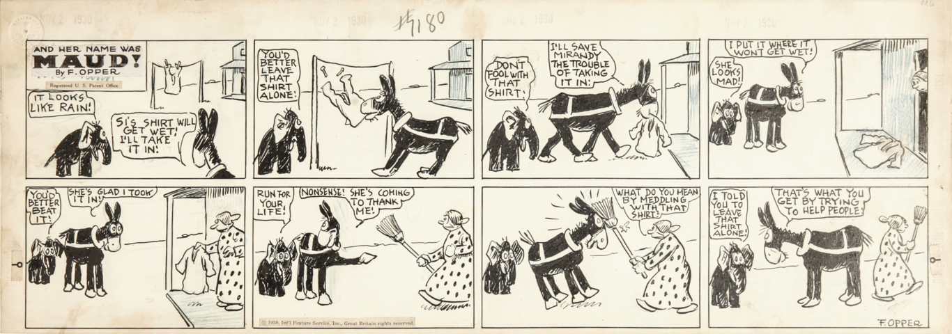 Frederick Opper "And Her Name Was Maud!", 1930 matita e china su cartoncino, 58,5 x 21 cm Tavola domenicale del 02/11/1930 per "And Her Name Was Maud!". Classico "topper" domenicale a corredo di Happy Hooligan, il simpatico mulo Moud riscosse un successo tale in Italia da essere pubblicato sulle pagine del Corriere dei Piccoli con il nome di Checca. Firmata.
