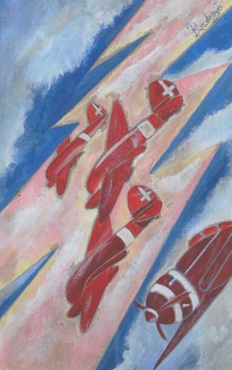 "Incursione aerea futurista" Olio su carta povera cm. H: 23.00 L: 16.00 Firma in alto a sinistra. Opera esposta alla Galleria d'Arte moderna "La Civetta (Ostia)" in occasione della mostra: "Futuristi e guerra futurista" dal '20 al '40. Certificato descrittivo dell'opera rilasciato dalla Galleria "La Civetta (Ostia)".