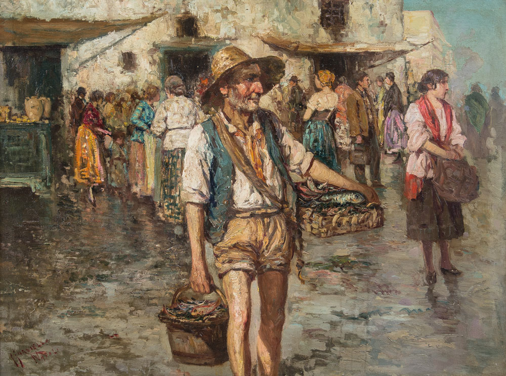 GIARDIELLO GIUSEPPE Napoli 1887 - 1920Mercatino del pesceolio su tavola cm....