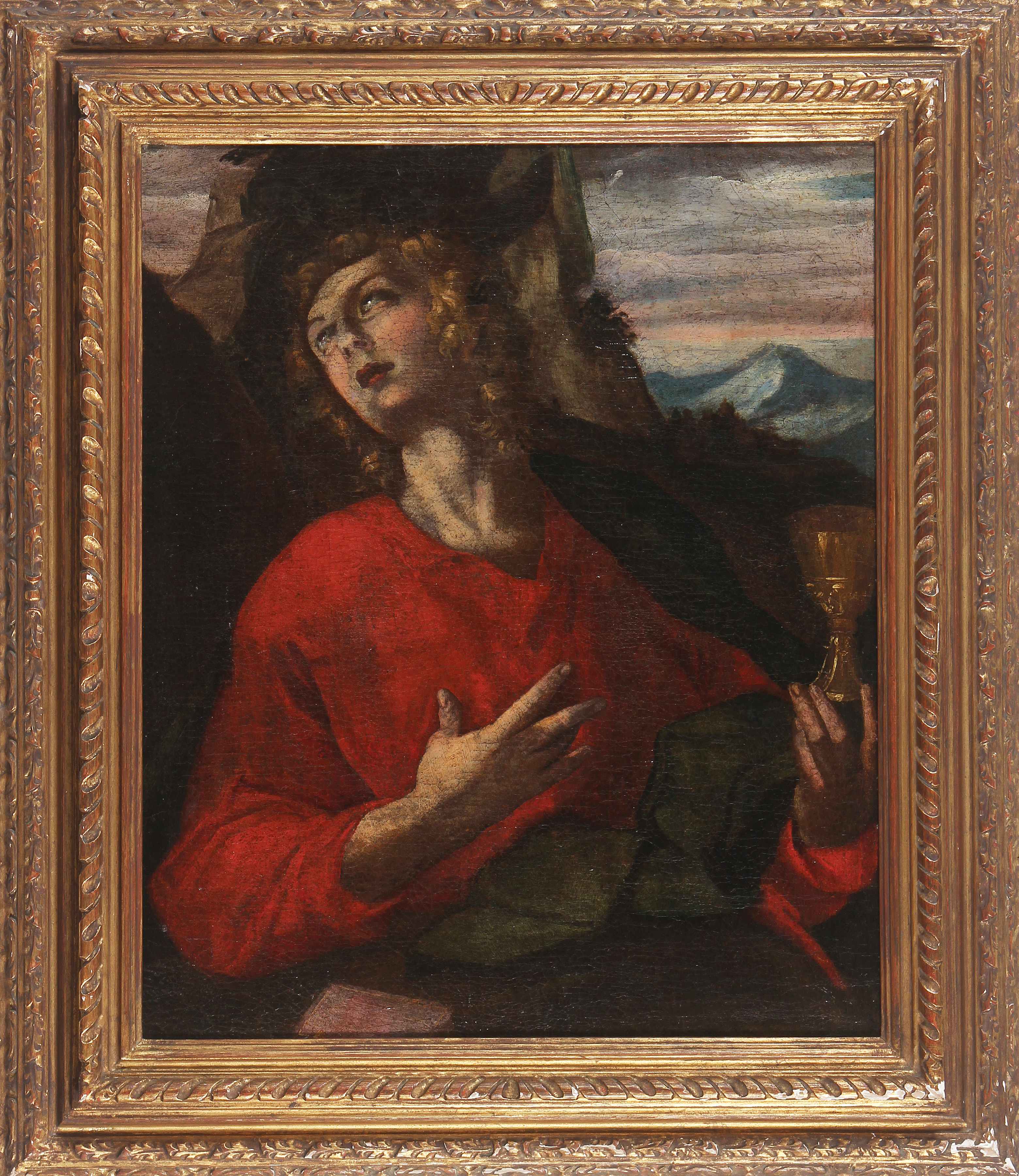 DELLO SCARSELLINO IPPOLITO SCARSELLA (1551 - 1620) Bottega di. San Giovanni Evangelista. Olio su tela . Cm 58,00 x 70,00. Autentica di Giuseppe Fiocco su fotografia. La tela presenta segni di crachelatura. DELLO SCARSELLINO IPPOLITO SCARSELLA (1551 - 1620) Workshop. St. John the Evangelist Oil on canvas Authentication by Giuseppe Fiocco on photograph. The canvas shows signs of cracking. 58,00 x 70,00 cm. . Cornice presente