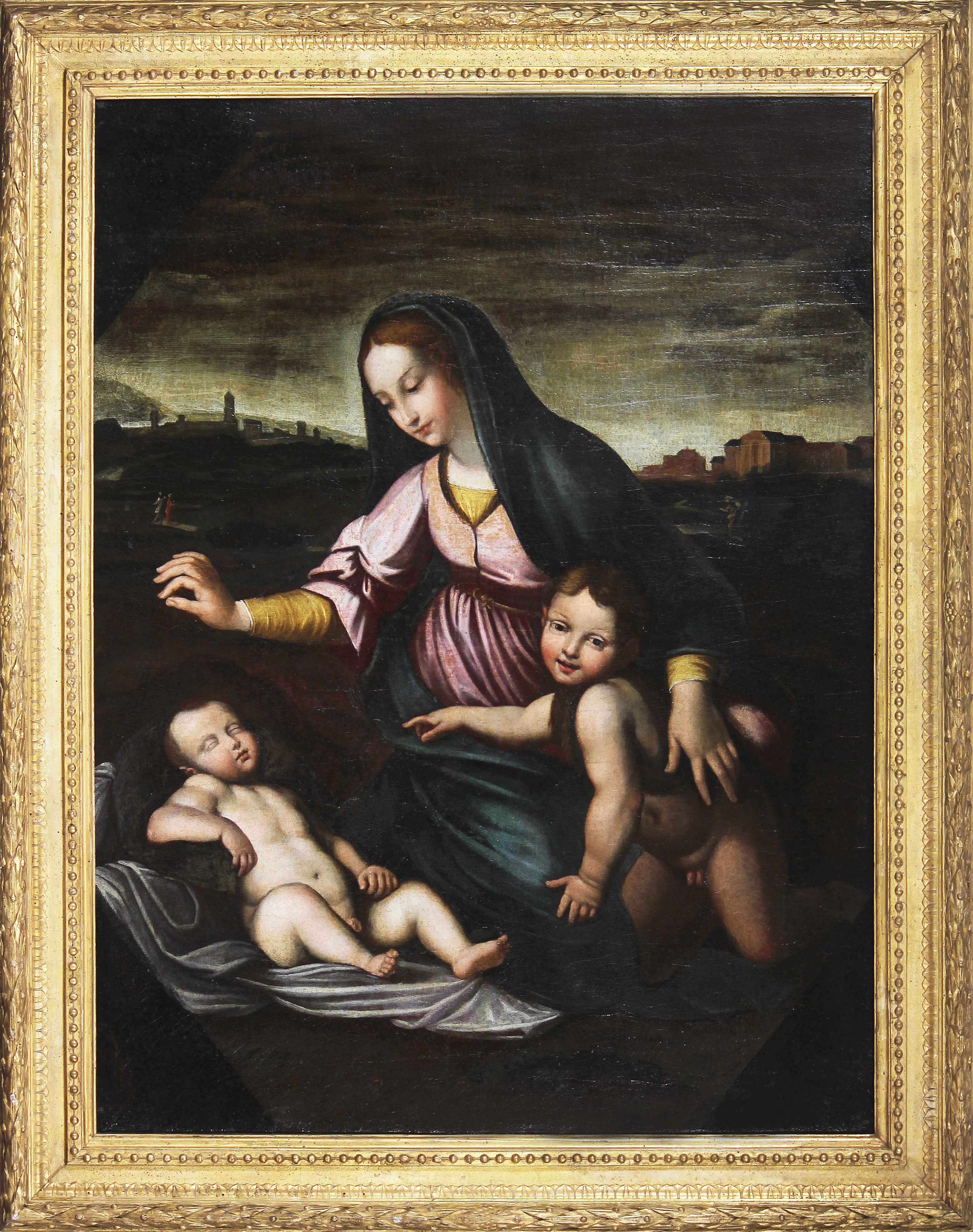 PITTORE TOSCANO DEL XVII SECOLO Madonna con bambino. Olio su tela . Cm 91,00 x 125,00. Bella cornice antica intagliata e dorata. XVII CENTURY TUSCAN ARTIST Madonna with child. Oil on canvas Beautiful antique carved and gilded frame. 91,00 x 125,00 cm. . Cornice presente