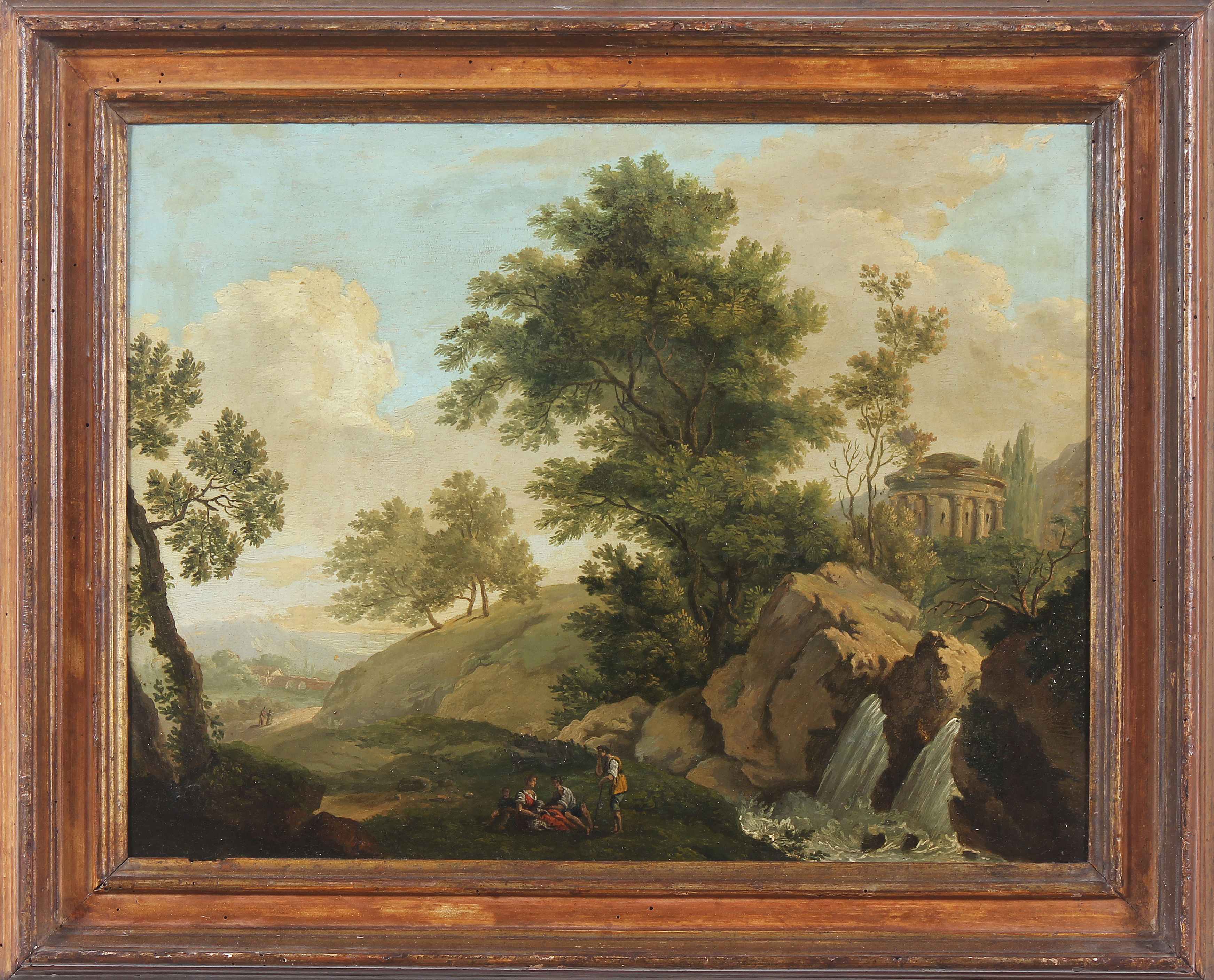 ANESI PAOLO (1697 - 1773) Paesaggio con viandanti. Olio su carta su tela. Cm 53,00 x 40,00. Pubblicazioni: Catalogo della mostra tenuta presso i Musei Civici Agli Eremitani, Padova, 2012. ANESI PAOLO (1697 - 1773) Landscape with Travellers. Oil on paper on canvas Publications: Catalogue of the exhibition held at the Musei Civici Agli Eremitani, Padua, 2012. 53,00 x 40,00 cm. . Cornice presente