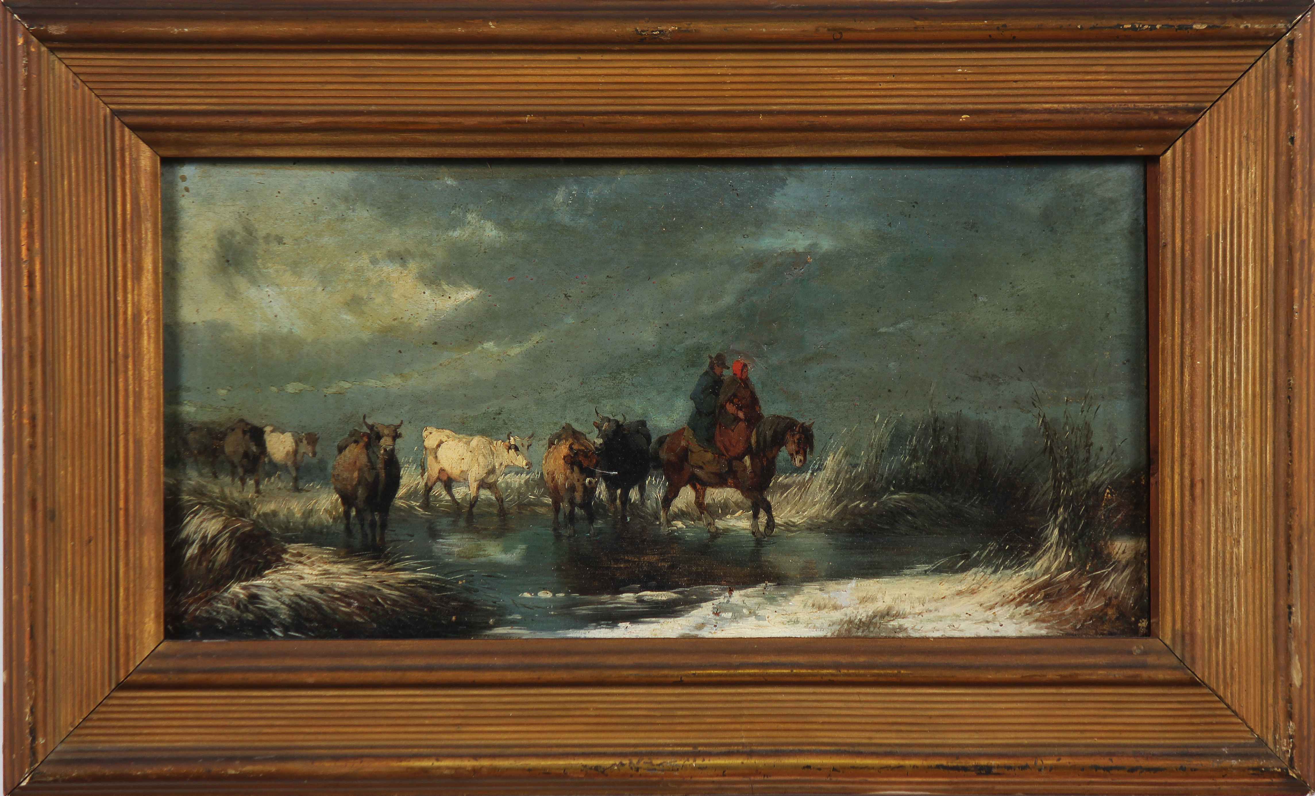JOLI FAUSTINO (1814 - 1876) Scena campestre d'inverno. Olio su tela . Cm 40,00 x 20,00. Presenta un antico restauro al centro e al retro. JOLI FAUSTINO (1814 - 1876) Rural Scene in Winter. Oil on canvas There has been historic restoration work on the centre and back. 40,00 x 20,00 cm.