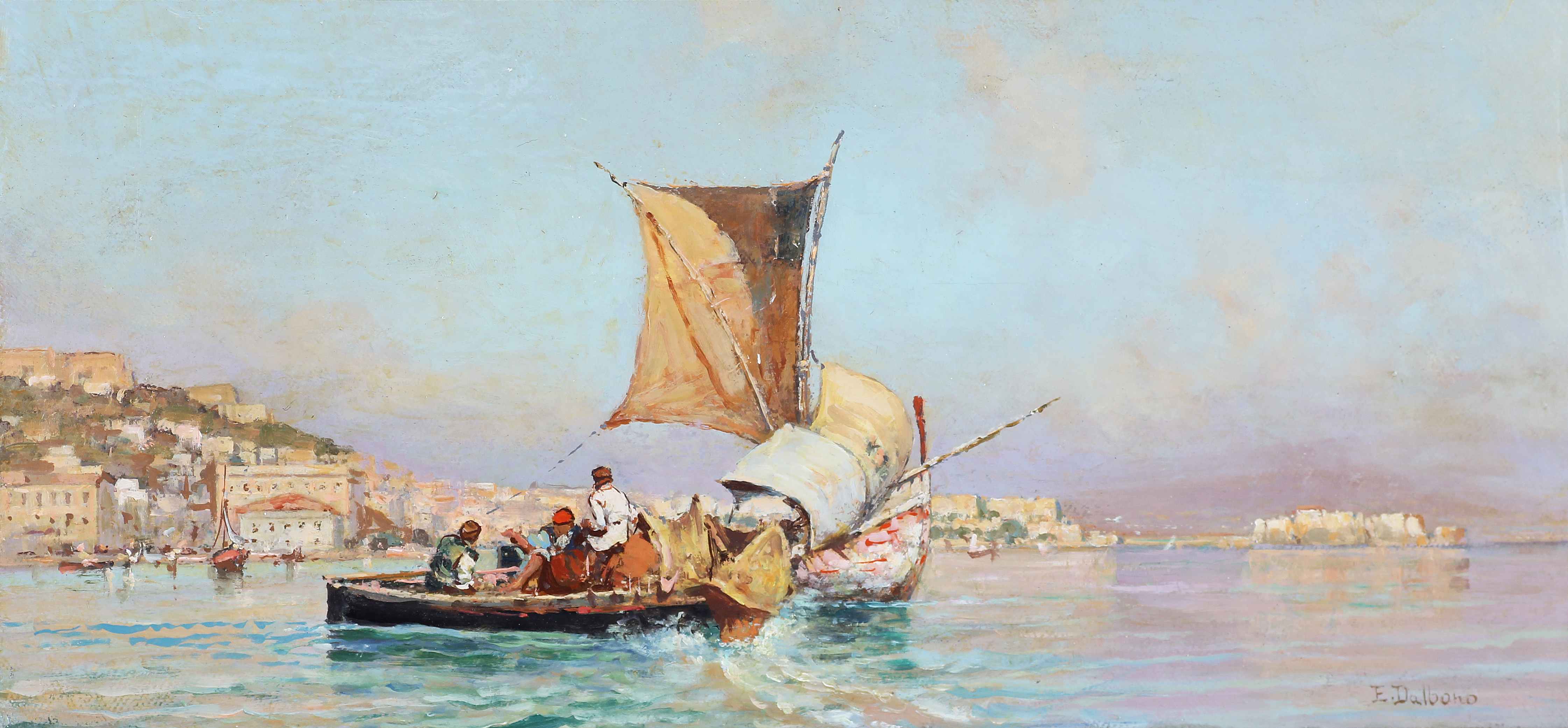DALBONO EDUARDO (1841 - 1915) Barche. Olio su cartoncino. Cm 33,50 x 16,50. Firma in basso a destra. DALBONO EDUARDO (1841 - 1915) Boats. Oil on cardboard Signature on bottom right. 33,50 x 16,50 cm. Cornice presente